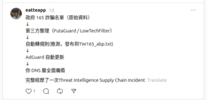 完整經歷了一次Threat Intelligence Supply Chain Incident 2026 年 02 月 01 日2026 年 02 月 01 日蝸牛 隨機文章debian 12 工作環境安裝 (2023-12-07)php與資訊安全 (2010-03-06)開立數位 饅頭機 VOVO V10 開箱測試文 (2013-12-15)I got the website stop message. Ubuntu Web-Server on Proxmox VE is crashed. (2021-02-20)CPU-VIA ULV 超低電壓 CPU 規格 (2007-11-03)隨機美圖